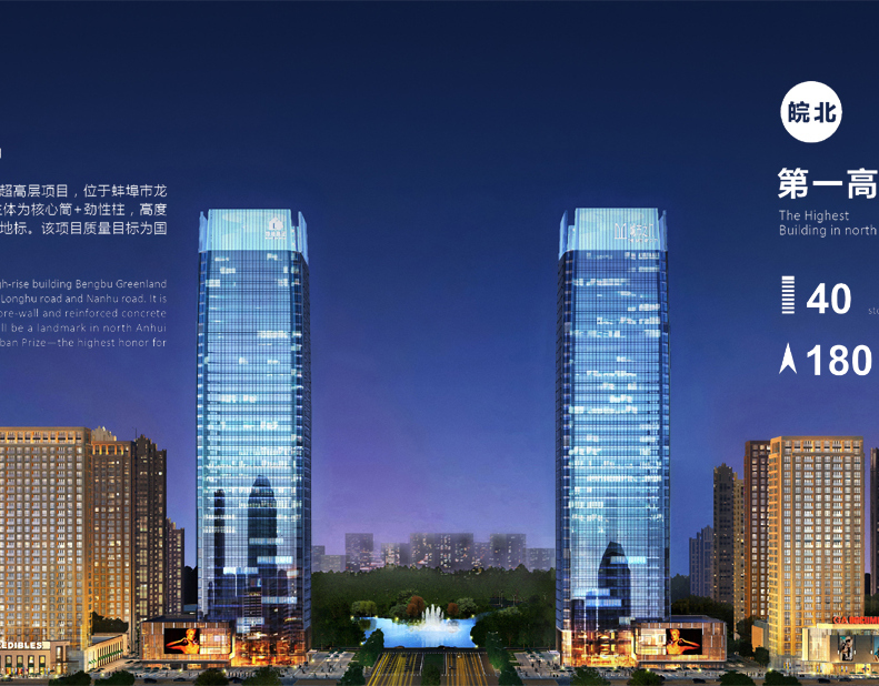 蚌埠市綠地中央廣場五期城市之門A座項目,位于蚌埠市檔案館南側,龍湖路與南湖路交口。主體為核心筒、框架柱及玻璃幕墻結構;建筑高度180米,40層,地下為一層車庫,層高5.5米;地上一層為辦公...